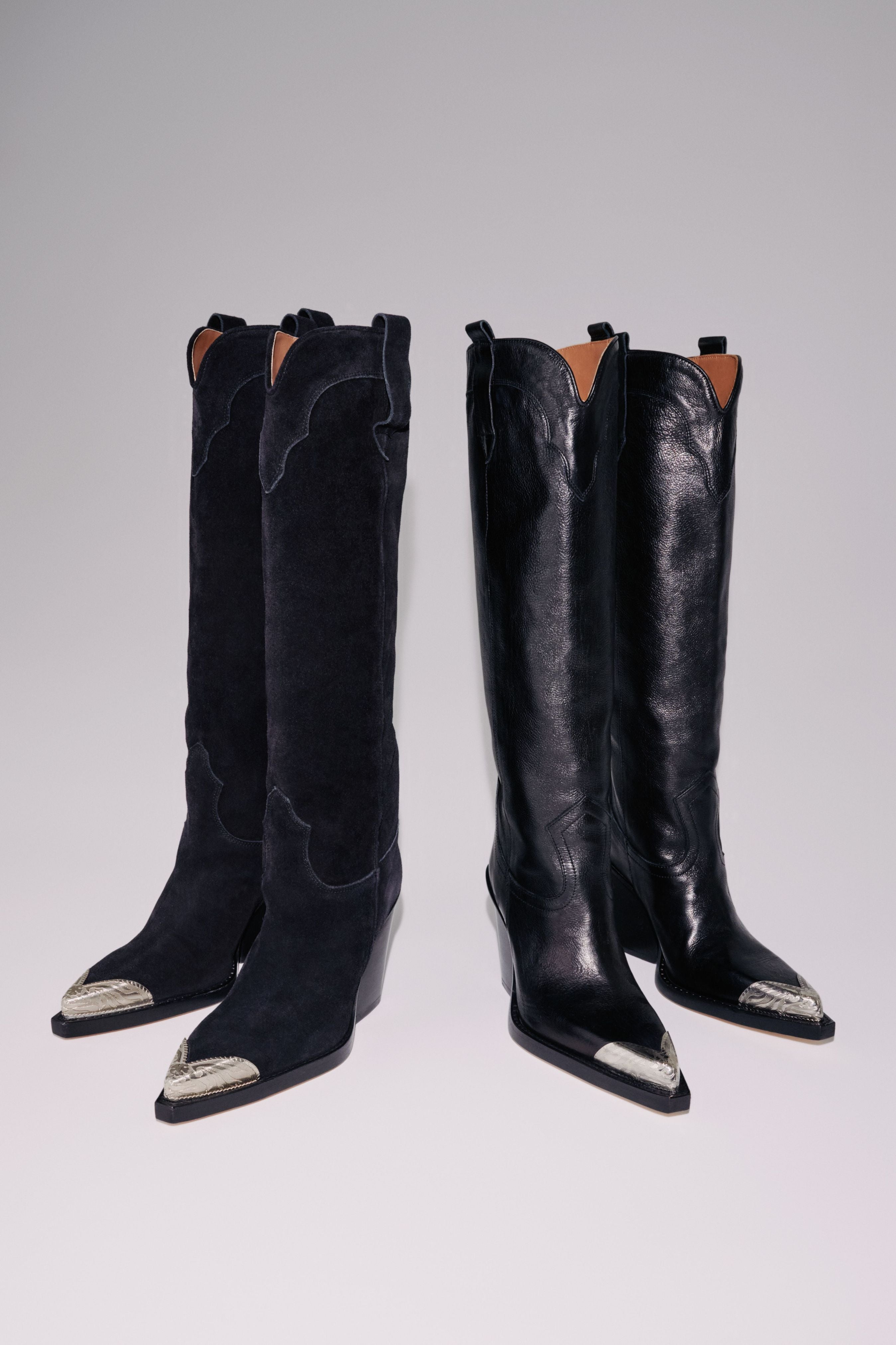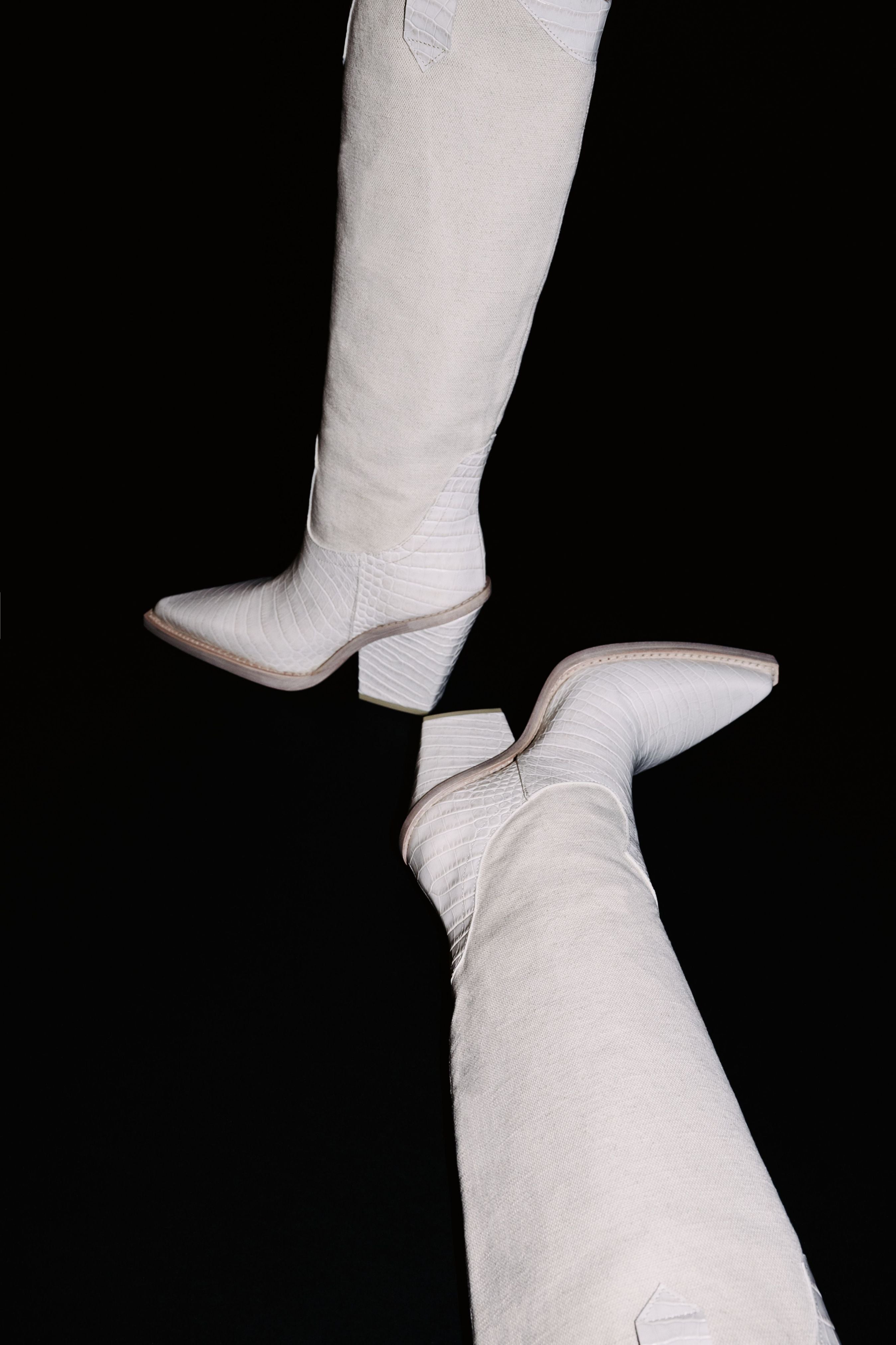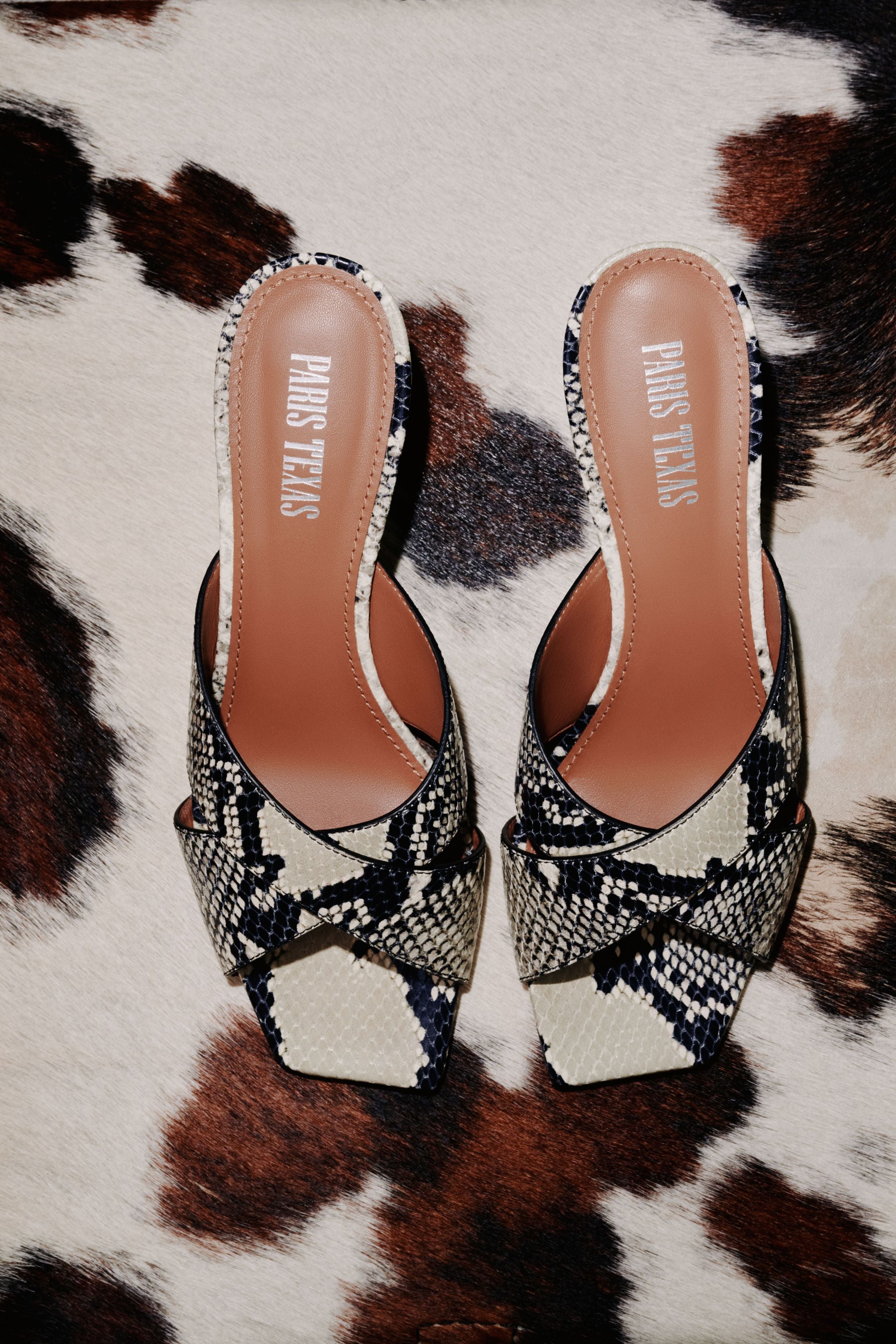A Wild Ride channels a glam roadtrip in Texas vibe highlighting exotic and warm-toned textures and the brand’s audacious, dual soul. The collection is inspired by the vast expanse of the desert crossed over by trails, which informs the Arizona sandal with its wraparound straps and Texan heel, theVicky wedge mule and Uma knee-high sandals.