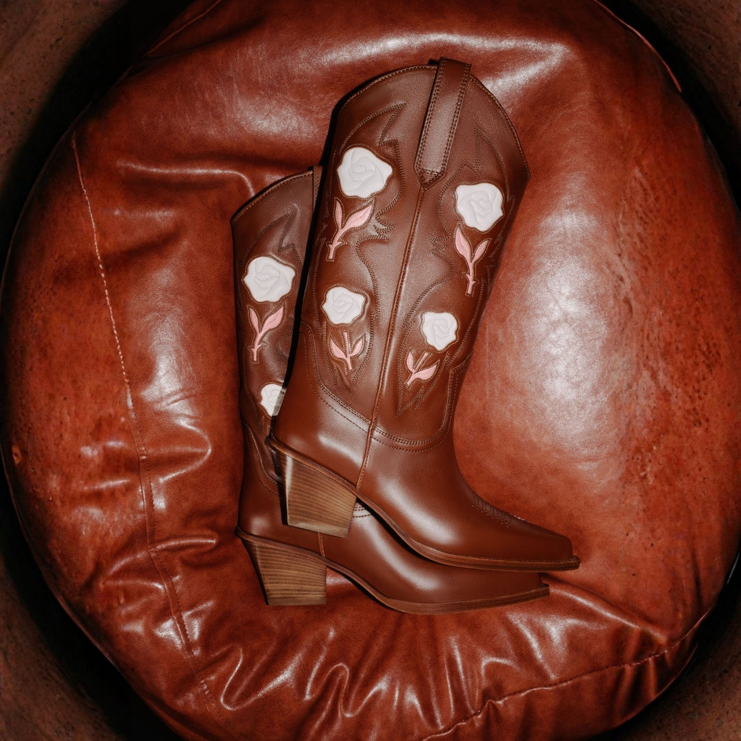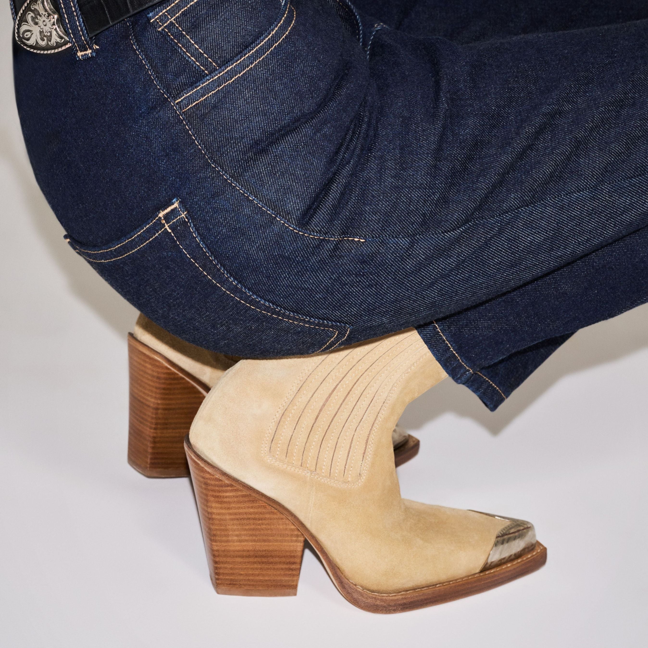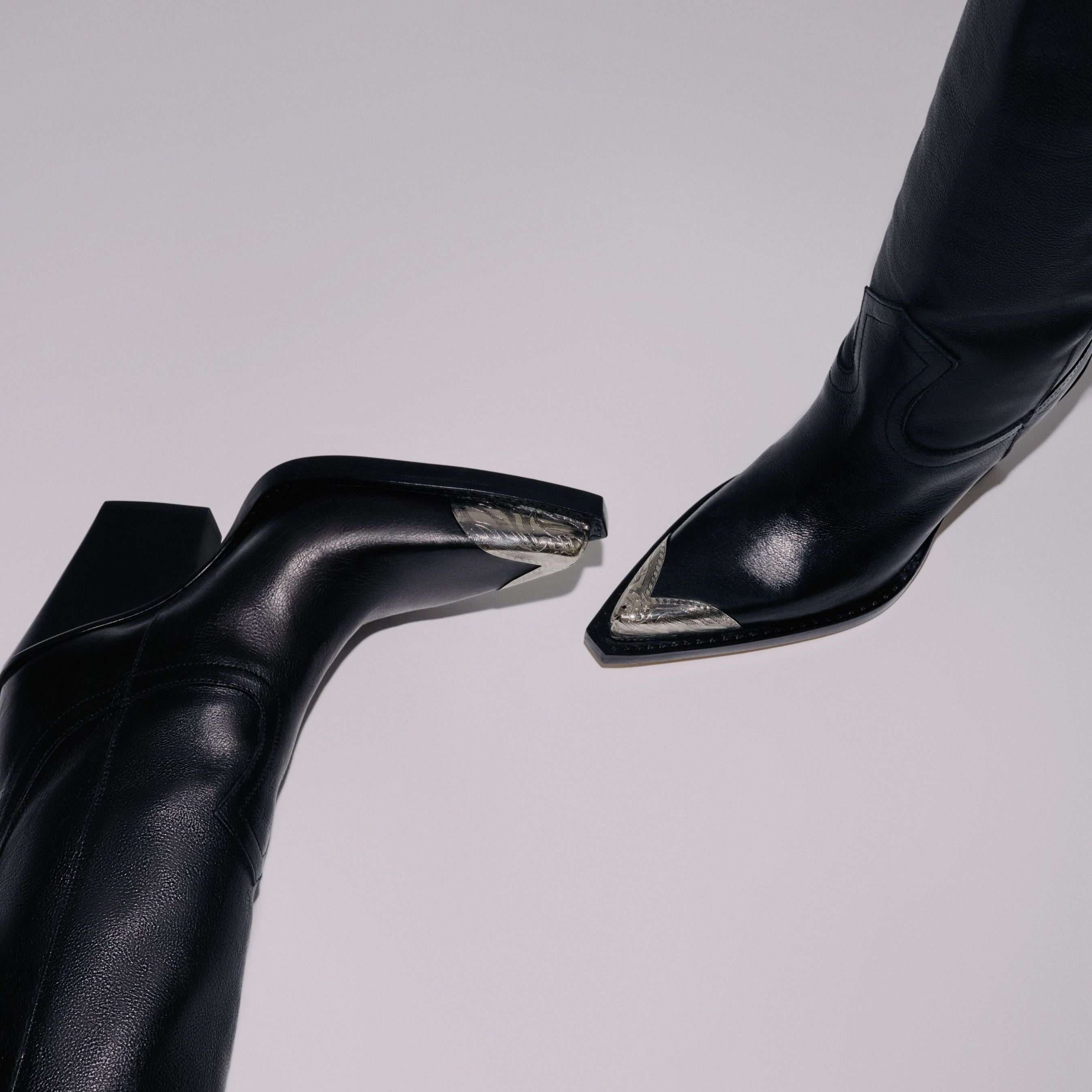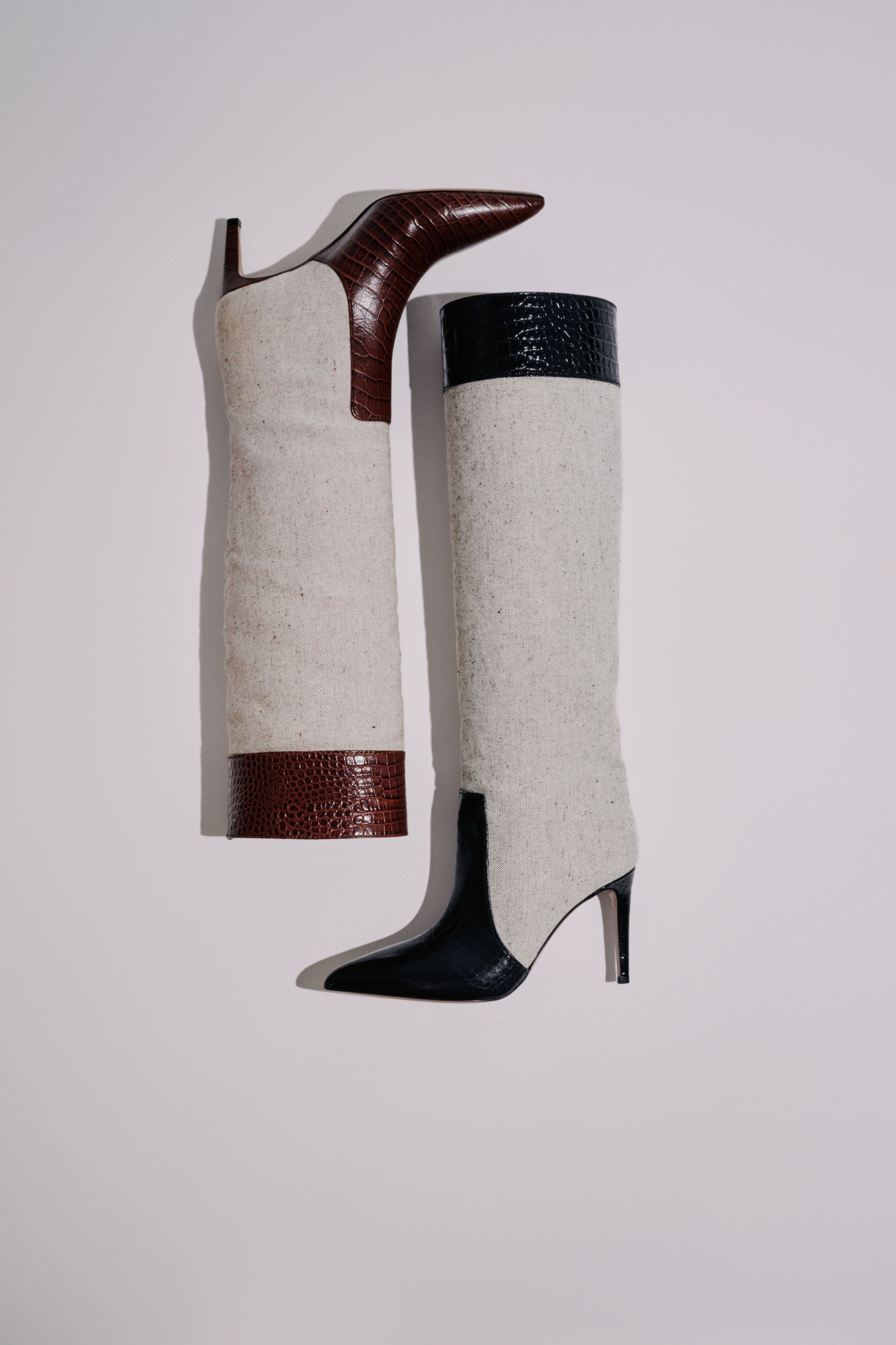 A Wild Ride channels a glam roadtrip in Texas vibe highlighting exotic and warm-toned textures and the brand’s audacious, dual soul. The collection is inspired by the vast expanse of the desert crossed over by trails, which informs the Arizona sandal with its wraparound straps and Texan heel, theVicky wedge mule and Uma knee-high sandals.